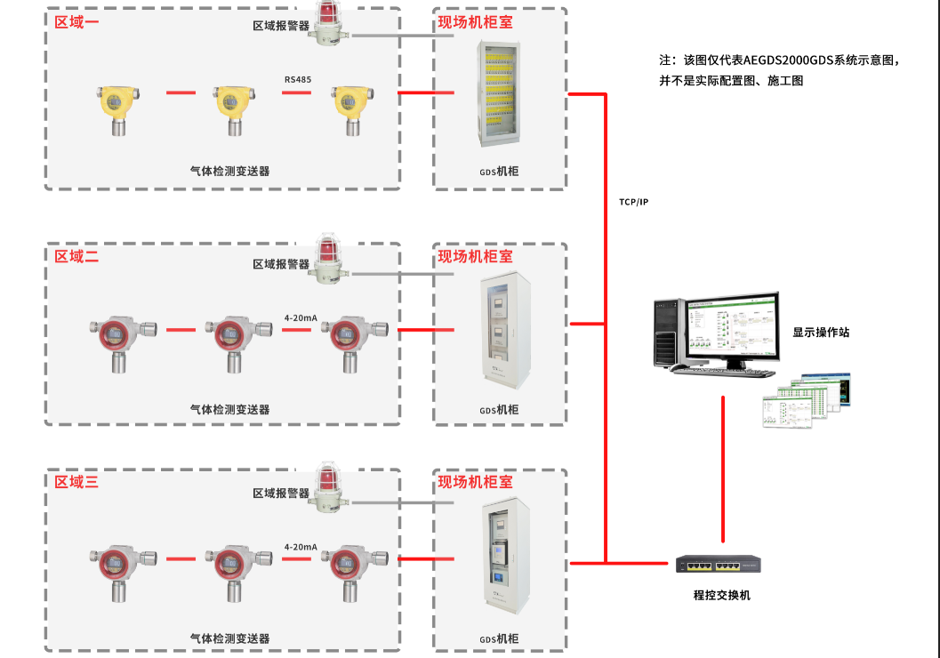 AEGDS2000型可燃?xì)怏w和有毒氣體檢測報(bào)警系統(tǒng)(以下簡稱GDS系統(tǒng))是根據(jù)石油、化工等行業(yè)要求研發(fā)的一套報(bào)警系統(tǒng)。系統(tǒng)由氣體檢測變送器、報(bào)警控制器/柜、斷路器、UPS電源、交換機(jī)、串口設(shè)備聯(lián)網(wǎng)服務(wù)器、上位機(jī)以及各種配件等組成。