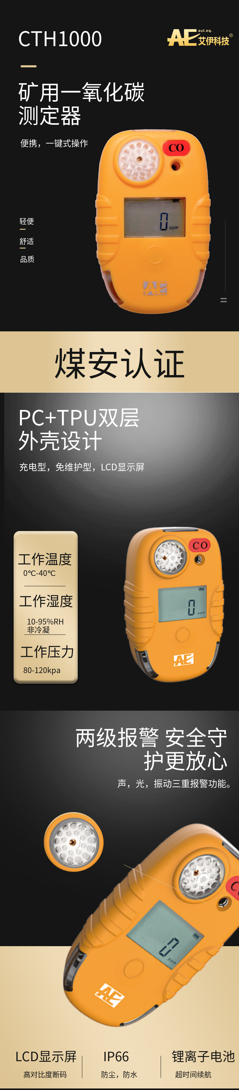 艾伊科技型CTH1000礦用一氧化碳測定器(以下簡稱測定器)適用于煤礦井下作業(yè)環(huán)境中一氧化碳?xì)怏w濃度的測量及報(bào)警。產(chǎn)品為全握式設(shè)計(jì),體積小巧,內(nèi)置電化學(xué)傳感器,響應(yīng)迅速。已獲得煤安認(rèn)證,CTH1000的防護(hù)等級達(dá)到IP66,可適用于環(huán)境惡劣場所,雙層設(shè)計(jì)的外殼在保證握持手感的同時(shí)也能經(jīng)受惡劣環(huán)境的考驗(yàn),同時(shí),單鍵操作大大減少誤操作可能。該探測器具有聲,光,振動三重報(bào)警功能。測定器具有操作簡單,攜帶方便,準(zhǔn)確可靠等優(yōu)點(diǎn)。