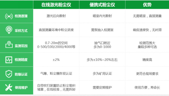 相較于便攜式粉塵儀,艾伊科技的在線粉塵濃度檢測儀具有顯著優(yōu)勢。它能夠?qū)崿F(xiàn)24小時不間斷監(jiān)測,實時反饋粉塵濃度數(shù)據(jù),一旦濃度超標(biāo),立即發(fā)出警報,有效預(yù)防安全事故的發(fā)生。同時,該儀器采用先進(jìn)的傳感技術(shù),測量精準(zhǔn),誤差小,為企業(yè)的安全生產(chǎn)提供了有力保障。以下是優(yōu)勢對比圖: