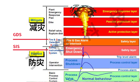 從圖中可以看出GDS系統(tǒng)是在氣體泄漏以后進(jìn)行報(bào)警提醒,屬于減災(zāi)層面,而SIS系統(tǒng)的緊急停車等系統(tǒng)更多屬于防災(zāi)層面,二者并不屬于相同的安全保護(hù)層。同時(shí)當(dāng)SIS系統(tǒng)故障時(shí),更需要獨(dú)立的GDS系統(tǒng)發(fā)揮功能。