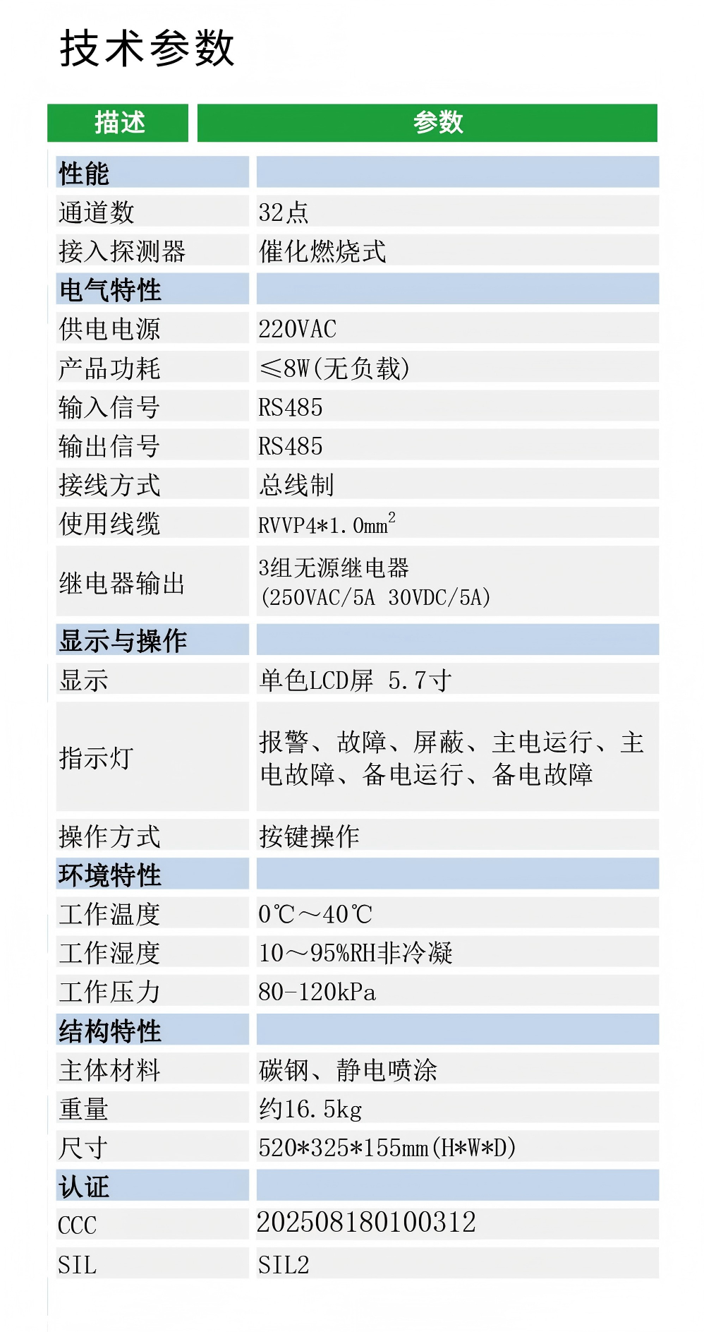 | 艾伊科技AGS2000F可燃氣體報警控制器用于總線制氣體檢測報警系統(tǒng),最大支持32點可燃氣體探測器接入回路。產(chǎn)品通過國家CCC消防認證,內(nèi)置開關(guān)量,自帶大屏液晶顯示屏,性能穩(wěn)定可靠,可廣泛應用于石油、化工、能源、鋼鐵、冶金、燃氣等行業(yè)。 產(chǎn)品通過國家CCC消防認證。 大屏幕LCD圖形顯示,顯示內(nèi)容豐富。 內(nèi)置多組開關(guān)量,可實現(xiàn)連鎖控制功能。 內(nèi)置UPS電源,可防止意外斷電導致的安全隱患。 壁掛式碳鋼外殼,堅固耐用。 支持RS485通信協(xié)議可燃氣體探測器接入系統(tǒng)。